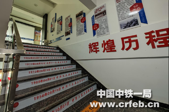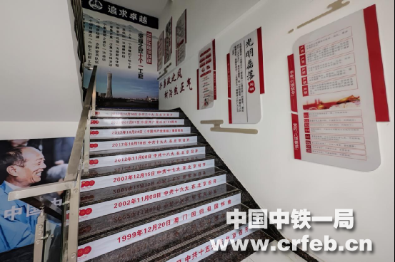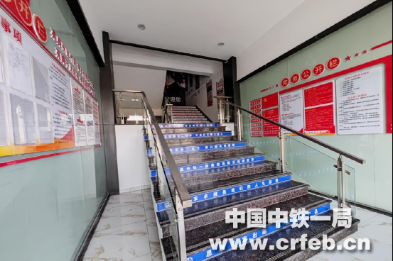 一樓左側墻面廠務公開欄,將項目部的有關工作公布于眾,讓每一名員工有知情權,能調動員工參與管理的積極性;右側的墻面黨務公開欄里,有“黨員權利”“黨員義務”以及“黨支部工作職責”等內容,既讓黨員們時時牢記自己的使命,又能起到請群眾監督黨員的作用。在樓梯的下部臺階立面除了企業核心價值觀等等,還張貼了“既然選擇了遠方,便只顧風雨兼程”“與其羨慕他人優秀,不如自己努力奮斗”等等勵志標語;上半部右側墻面,是黨的“輝煌歷程”知識,臺階立面張貼著黨的幾次代表大會召開的時間和地點等黨建歷史文化。在樓梯間的墻壁上,一幅習近平總書記接見中鐵一局電力工高級技師竇鐵成的大型照片映入眼簾,使員工們倍感親切、深受鼓舞、信心滿滿,員工的榮譽感、自豪感油然而生