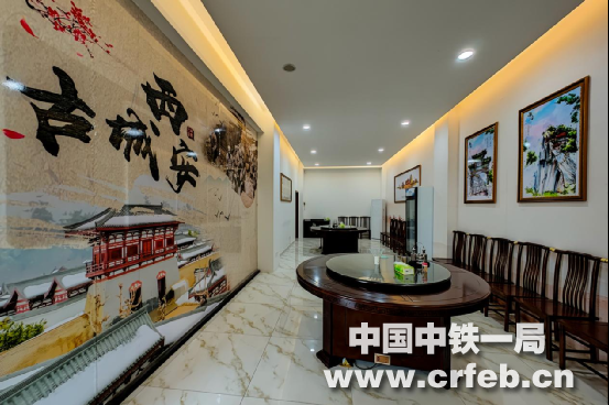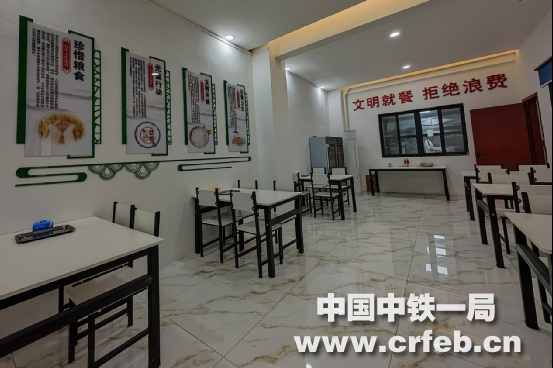 走入一樓項目員工生活區,大門右側的小餐廳里,厚重的“古城西安”“雁塔晨鐘”“華岳仙掌”等陜西歷史人文文化,使占到項目部總人數50%的秦人有一種“回到家鄉”的親切感;在大餐廳,“注意衛生”“文明用餐”“光盤行動”等餐飲文化懸掛墻壁,提醒著員工珍惜糧食,牢記“粒粒皆辛苦”。