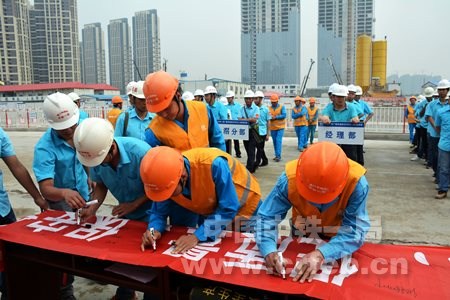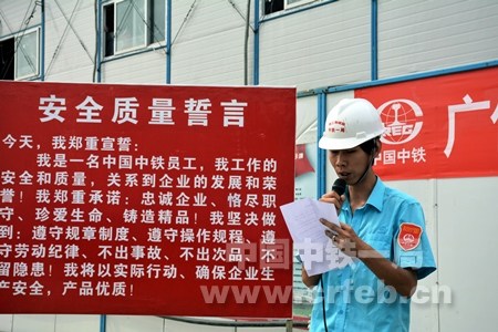 廣佛環(huán)項(xiàng)目安全總監(jiān)張榮慶、隧道分部經(jīng)理彭銳介紹了東平2號隧道施工安全教育培訓(xùn)情況;技術(shù)主管覃景貴介紹了隧道主體結(jié)構(gòu)施工概況;全體與會(huì)人員進(jìn)行“安全質(zhì)量誓言”宣誓;孟磊代表全體群眾安全監(jiān)督員宣讀了群安員倡議書;彭洋代表全體青安崗崗員宣讀了青安崗倡議書;隨后全體與會(huì)人員在“反三違、查隱患、促質(zhì)量、保安全”橫幅上簽名。