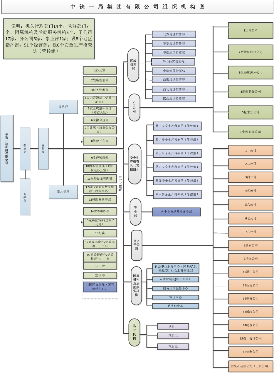 集團(tuán)公司機(jī)關(guān)本部共設(shè)置21個(gè)部門,其中行政部門14個(gè),黨群部門7個(gè)(黨委巡察辦、黨委督查辦為一套管理人員,履行相應(yīng)職責(zé))。行政部門具體為辦公室(黨委辦公室、董事會(huì)辦公室、保密委員會(huì)辦公室)、戰(zhàn)略規(guī)劃部、財(cái)務(wù)管理部、人力資源部(黨委干部部)、安全質(zhì)量環(huán)保部(稽查大隊(duì))、法律合規(guī)部、審計(jì)部(監(jiān)事會(huì)辦公室)、經(jīng)營(yíng)開(kāi)發(fā)部、生產(chǎn)管理部、商務(wù)管理部(項(xiàng)目收尾辦公室)、科技創(chuàng)新與數(shù)字化部、物資設(shè)備管理部、投融資管理部、國(guó)際事業(yè)部(國(guó)際營(yíng)銷中心);黨群部門具體為黨委組織部、黨委宣傳部(企業(yè)文化部)、紀(jì)委、黨委巡察辦、黨委督查辦、工會(huì)、團(tuán)委。集團(tuán)公司下設(shè)8個(gè)地區(qū)指揮部,51個(gè)經(jīng)營(yíng)部,負(fù)責(zé)經(jīng)營(yíng)開(kāi)發(fā)工作;設(shè)6個(gè)安全生產(chǎn)稽查隊(duì)(管控組)負(fù)責(zé)安全監(jiān)管工作。集團(tuán)公司下設(shè)17家子公司、6家分公司、1家事業(yè)部。具體信息附圖