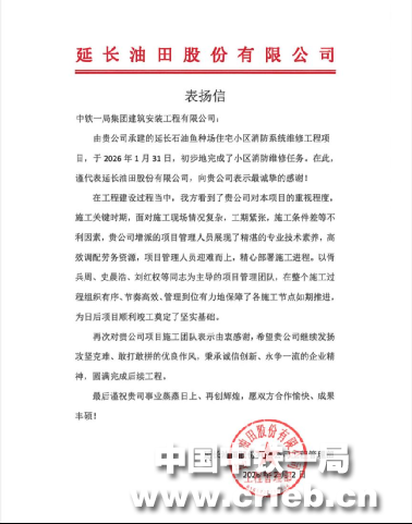 近日,延長油田股份有限公司工程管理部向中鐵一局建安公司延長石油魚種場住宅小區消防系統維修工程項目發來表揚信,對項目管理團隊迎難而上完成目標任務的優異表現給予肯定和表揚!