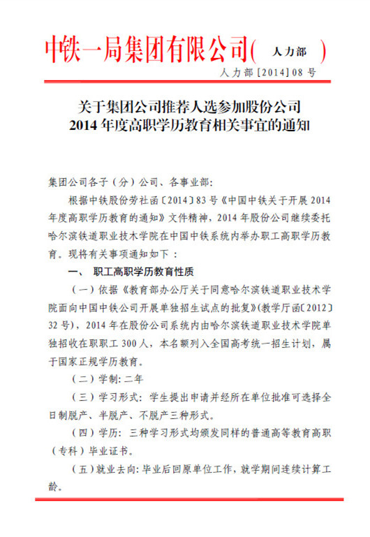 關于集團公司推薦人選參加股份公司2014年度高職學歷教育相關事宜的通知