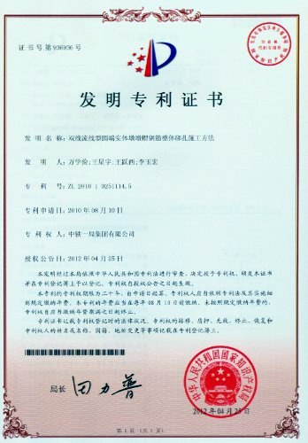 我公司自主研發的"雙線流線型圓端實體墩墩帽鋼筋整體綁扎施工方法"獲得國家知識產權局發明專利授權。