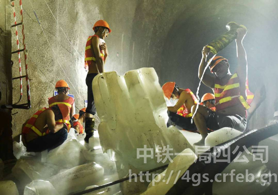 隧道的高地?zé)崾故┕きh(huán)境達到41攝氏度,工人們在冰塊上休息,輪換作業(yè)。