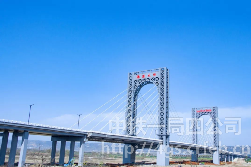 寶雞陸港大橋是寶雞市渭河上高度最高、寬度最寬、跨度最大的城市橋梁,全長1272米,橋梁上跨南北河堤路、渭河及連霍高速,為雙向八車道,設計時速每小時60公里。主橋為雙塔雙索面鋼箱梁斜拉橋,跨徑布置為(102+208+102)米,大橋橫梁整體提升重量大、同步控制要求高、定位精調難度大、空中懸停時間長、施工組織和技術要求高。門式鋼桁架主塔提升施工工藝應用于格構式鋼塔斜拉橋塔頂拱形橫梁的施工屬國內首次,項目榮獲2020年度“中國中鐵杯”優質工程。