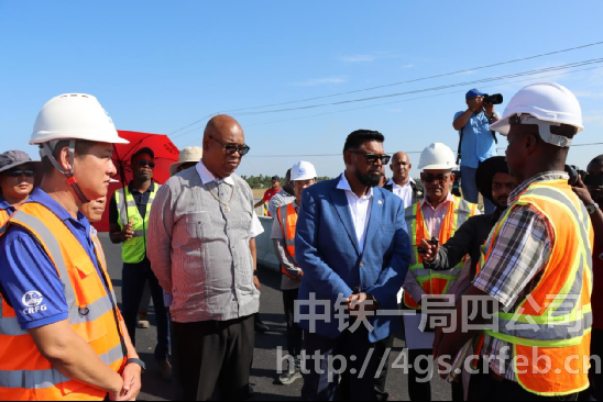 當(dāng)?shù)貢r間10月1日,圭亞那總統(tǒng)穆罕默德·伊爾凡·阿里一行到中鐵一局圭亞那ECD二期DB公路項目開展實地調(diào)研并慰問節(jié)日期間堅守崗位的中方建設(shè)人員。
