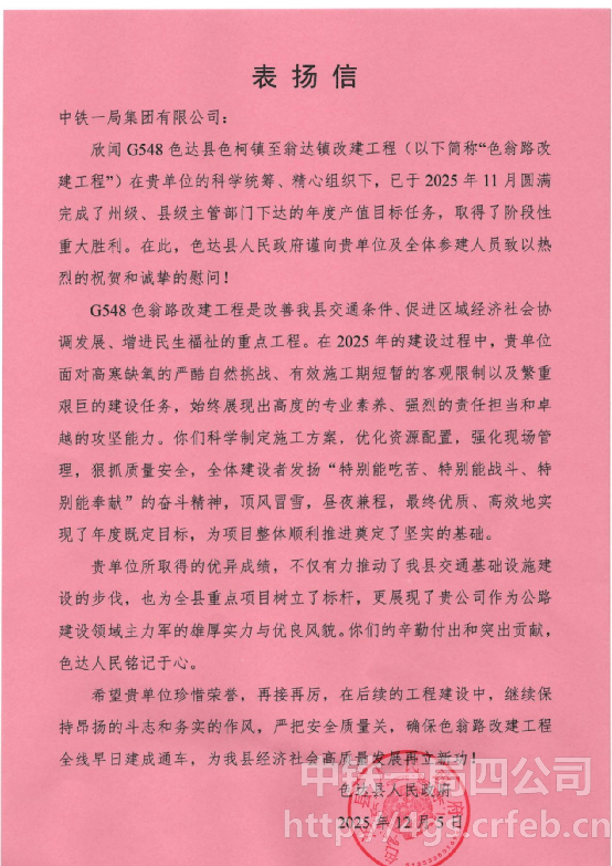 朦霧漫過色達金馬草原的經(jīng)幡,將3900米海拔的清冽揉進冬日的風中。八百年前格薩爾王賽馬稱雄的草甸上,曾回蕩著茶馬古道“棧道千里,通于蜀漢”的滄桑駝鈴。近日,這千年的回響正被一場現(xiàn)代筑路史詩接續(xù),國道548改擴建項目圓滿完成州級、縣級年度產(chǎn)值目標任務,取得了階段性重大勝利,并收到色達縣人民政府來信表揚,于川西高原的群山間,書寫著生態(tài)與創(chuàng)新并舉的時代新篇。