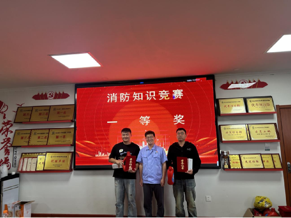 消防知識競賽一等獎獲獎選手與頒獎者合影
