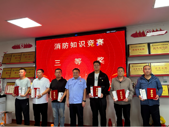 消防知識競賽三等獎獲獎選手與頒獎者合影