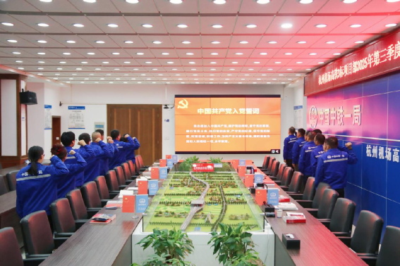 “我志愿加入中國共產黨,擁護黨的綱領,遵守黨的章程……” 在黨支部書記的領誓下,全體黨員一同面向黨旗高舉右拳,莊嚴宣誓。黨支部書記強調:“當前項目站前工程進度已過半,正是攻堅沖刺的關鍵階段。全體黨員要在項目高標準建設、企業高質量發展中當標桿、作表率,讓黨員身份在工地上閃光。”
