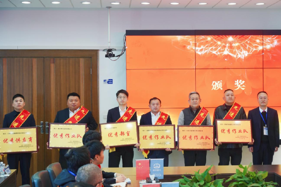 在“雙先”表彰會上,項目負責人宣讀項目部2025年度“雙先”表彰文件,對在年度生產攻堅突破、團隊配合協作、內控管理提升、后勤服務保障等各項工作中表現突出的6個“先進集體”和15名“先進個人”予以表彰并頒發獎牌及榮譽證書。表彰環節后,先進個人與先進集體代表先后登臺交流發言。會議強調,先進代表是項目建設的中堅力量與精神旗幟,全體參建員工要以先進為榜樣,主動汲取奮進力量,傳承務實擔當作風,在項目收官沖刺的關鍵階段凝心聚力、勇毅攻堅,共同推動項目建設再攀新高。