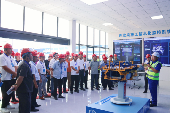 在江東特大橋43#墩智慧造橋機施工現場,交流團一行首先觀看了工藝工裝和智慧造橋機應用專題匯報視頻。項目技術負責人通過“3D模型和信息化系統可視化演示”,詳細介紹智慧造橋機在施工精度控制、結構穩定性監測及自動化作業等方面的創新應用;隨后,交流團實地察看橋梁“五小四新”應用成果,近距離觀察智慧造橋機承重桿件等組成部分,對項目團隊在工藝工裝創新應用、智慧化建造探索等方面的工作給予高度評價。