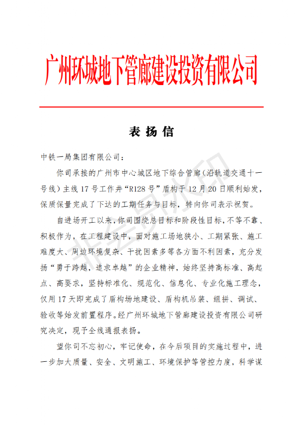 12月24日,公司廣州中心城區地下綜合管廊項目經理部一分部,收到業主一封熱情洋溢的表揚信,信中稱贊項目部克服重重困難,保證了綜合管廊主線17號井盾構成功始發。