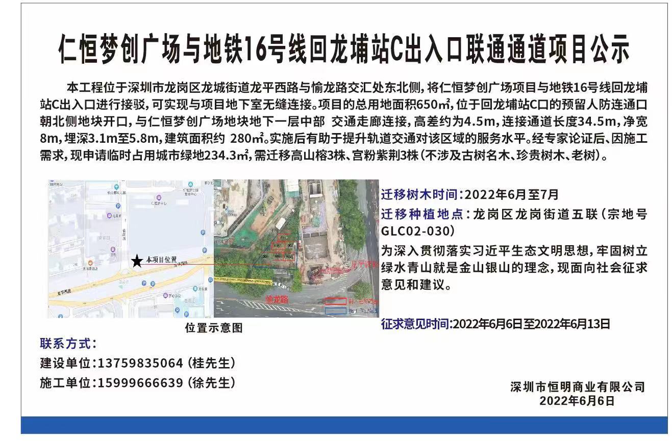 仁恒夢創廣場與地鐵16號線回龍埔站C出入口聯通通道項目公示