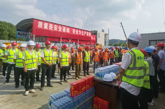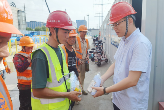 與會領(lǐng)導(dǎo)共同為一線作業(yè)工友送去了西瓜、鹽汽水等清涼物資及藿香正氣水、人丹等防暑禮包,將關(guān)懷送到了每個工友的手中。