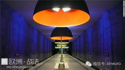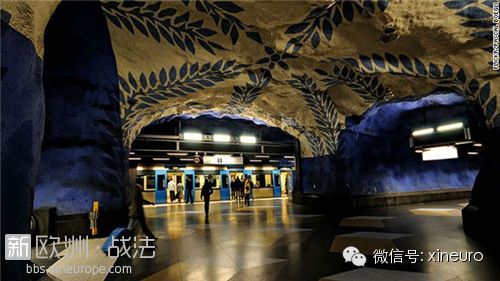 斯特哥爾摩的T-Centralen站位于地面。走進里面,藍色和白色的天花板和溶洞似的月臺讓乘客感覺置身于地下世界。