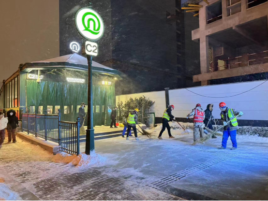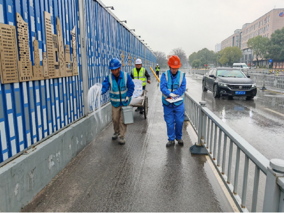 項目為應對新一輪寒冷極端天氣,一方面編制由項目領導班子帶班的應急值班表,項目部全員24小時待命,做好隨時應急準備,另一方面準備融雪所需的融雪劑、草袋、鐵鍬、裝載車及登高車等特種設備,保證人工融雪工作開展。一場低溫風雪,項目部全體人員迅速行動,高效除冰除雪,為周邊居民平安出行保駕護航,充分彰顯一局央企的責任擔當和鐵軍風采。