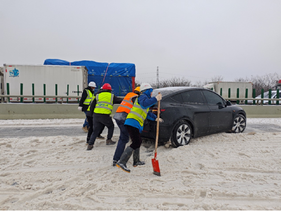 21日晚,正在勝~閆區間值守巡邏的項目安全員看到一輛小轎車在工地門口上坡拐彎路段車輪打滑、停滯不前,立馬和幾名同事一起協助推車前行,直至成功拐過彎道。車主趙先生說:“鄭州路是我每天上下班的必經之路,之前幾次暴雪后路過時,不是看到一局人在周邊道路除雪,就是積雪已被清理干凈,我作為青島市民為你們點贊。”
