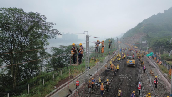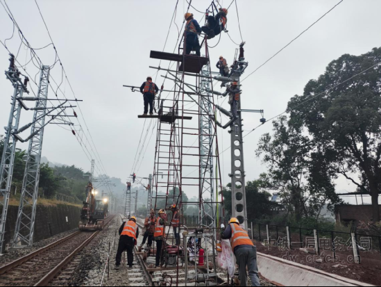 30日撥接施工當(dāng)天,鋪架、接觸網(wǎng)等多個(gè)專業(yè)在江津至黃磏區(qū)間多個(gè)作業(yè)點(diǎn)同步展開施工,現(xiàn)場(chǎng)人員密集、機(jī)械運(yùn)轉(zhuǎn)頻繁、上下部交叉作業(yè)組織難度大。為應(yīng)對(duì)復(fù)雜施工局面,項(xiàng)目部設(shè)立“四電專業(yè)Ⅱ級(jí)天窗施工總指揮部”,下設(shè)三大組十小組,共投入80余人及3輛大型機(jī)械,以“安全第一、力保開通”為原則,統(tǒng)一指揮、協(xié)同作業(yè),嚴(yán)格執(zhí)行安全操作規(guī)定與技術(shù)標(biāo)準(zhǔn),高效完成既有接觸網(wǎng)拆除、懸掛調(diào)整等關(guān)鍵工序。經(jīng)全體人員連續(xù)270分鐘奮戰(zhàn),圓滿完成了線路開通目標(biāo)。