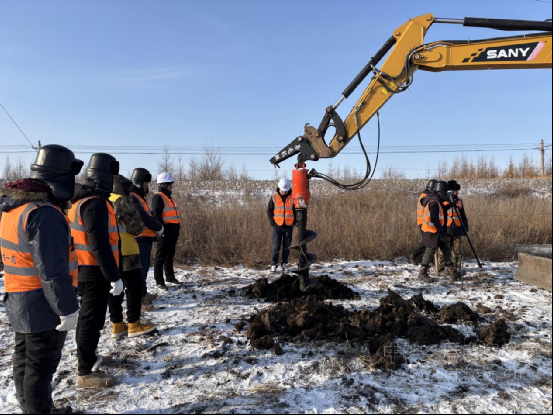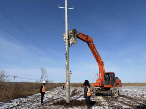 作為鐵路運營的“電力生命線”,10kV貫通線為沿線通信、信號設備及站場用電等重要設施提供穩定電力,是保障鐵路安全高效運行的關鍵。此次施工面臨零下20℃極寒低溫、30 厘米厚季節性凍土層,以及持續降雪、路面結冰等惡劣條件,給勘測選址、基礎施工及設備安裝帶來極大困難。面對這些挑戰,項目團隊提前2個月啟動籌備工作,組建專項攻堅小組,利用“無人機航拍+地質勘探”的方式進行勘測,避開凍土消融區和積雪積壓帶,敲定最優施工路線;針對凍土特性制定專項方案,采用履帶式旋挖鉆開挖凍土,在冰面上鋪設鋼板防滑,使用吊車垂直吊裝電桿,將誤差嚴控在3%以內。電桿埋入基坑后,采用分層回填的方式,每層敷設20厘米厚,共鋪設三層,壓實度達到95%以上,有效防止凍土凍脹沉降。施工全程進行安全監控,并安排專人在后續巡查記錄電桿傾斜、沉降情況,避免意外事件發生。