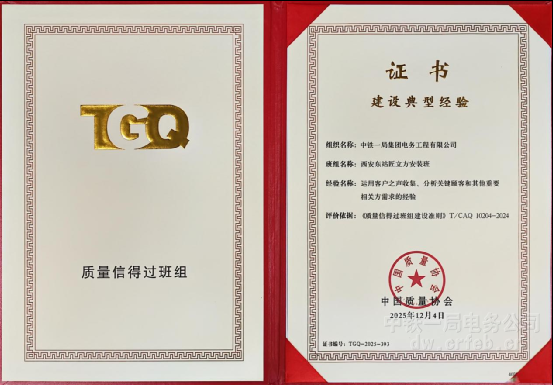 項目組建的西安東站匠立方安裝班,成功獲評中國質量協會“質量信得過班組”國家級榮譽。該班組于2023年12月成立,主要負責西安東站工程通信、信號、電力及電力牽引供電的“四電”系統集成施工。施工過程中,班組緊緊圍繞“標桿管理促提升、施工效率創一流”目標,將標準化作業貫穿施工全流程,在安裝工序中嚴控細節、嚴把質量關,同時緊抓安全生產工作,累計排查整改安全隱患56項;通過推行任務計劃管理表,按等級細化任務分工,班組高效完成各項節點任務,憑借穩定可靠的施工質量與高效協同的作業能力,獲得業內充分認可。