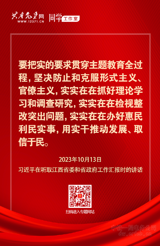 2023年10月13日,習(xí)近平總書(shū)記在聽(tīng)取江西省委和省政府工作匯報(bào)時(shí)指出,要總結(jié)運(yùn)用第一批主題教育的成功經(jīng)驗(yàn),高質(zhì)量開(kāi)展第二批主題教育,用井岡山精神、蘇區(qū)精神、長(zhǎng)征精神砥礪黨員、干部,教育引導(dǎo)黨員、干部堅(jiān)定理想信念、牢記初心使命、積極開(kāi)拓進(jìn)取、勇于擔(dān)當(dāng)作為。要把實(shí)的要求貫穿主題教育全過(guò)程,堅(jiān)決防止和克服形式主義、官僚主義,實(shí)實(shí)在在抓好理論學(xué)習(xí)和調(diào)查研究,實(shí)實(shí)在在檢視整改突出問(wèn)題,實(shí)實(shí)在在辦好惠民利民實(shí)事,用實(shí)干推動(dòng)發(fā)展、取信于民。【點(diǎn)擊學(xué)習(xí)】