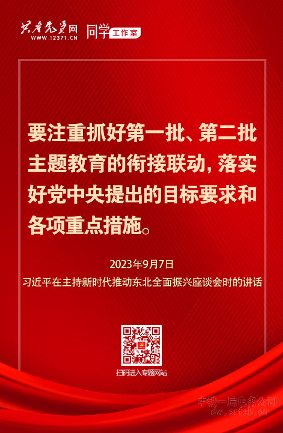 2023年9月7日,習(xí)近平總書(shū)記在主持召開(kāi)新時(shí)代推動(dòng)?xùn)|北全面振興座談會(huì)時(shí)強(qiáng)調(diào),要注重抓好第一批、第二批主題教育的銜接聯(lián)動(dòng),落實(shí)好黨中央提出的目標(biāo)要求和各項(xiàng)重點(diǎn)措施。深化理論學(xué)習(xí),用新時(shí)代中國(guó)特色社會(huì)主義思想凝心鑄魂,把黨員、干部的思想和行動(dòng)統(tǒng)一到黨中央決策部署上來(lái),增強(qiáng)信心、提振精神。大興調(diào)查研究,提高黨員、干部特別是領(lǐng)導(dǎo)干部科學(xué)謀劃工作、解決實(shí)際問(wèn)題、抓好工作落實(shí)能力。著眼推動(dòng)高質(zhì)量發(fā)展,教育引導(dǎo)黨員、干部完整準(zhǔn)確全面貫徹新發(fā)展理念,貫徹以人民為中心的發(fā)展思想,以科學(xué)態(tài)度和務(wù)實(shí)精神開(kāi)創(chuàng)發(fā)展新局面。加強(qiáng)檢視整改,督促黨員、干部正視和解決黨性黨風(fēng)黨紀(jì)方面的問(wèn)題,以新風(fēng)正氣振奮人民群眾發(fā)展信心。
