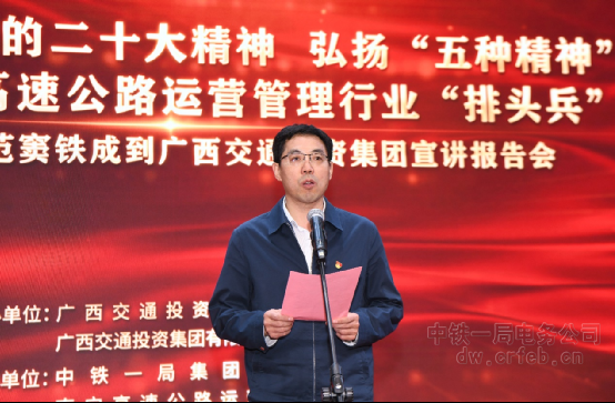 參加此次報(bào)告會(huì)的還有廣西交投公路運(yùn)營部部長黃建有、副部長潘華良,南寧高速公路運(yùn)營公司黨委書記、董事長徐晶,黨委副書記、總經(jīng)理李乃強(qiáng),廣西交投各運(yùn)營公司及相關(guān)單位主要領(lǐng)導(dǎo)、分管領(lǐng)導(dǎo)及員工代表,廣西桂秦公路工程有限公司黨委副書記黨強(qiáng),中鐵一局電務(wù)公司黨委副書記、總經(jīng)理劉穩(wěn),黨委委員、副總經(jīng)理羅繼國等。廣西交投所屬各單位未到場黨員干部員工還以視頻分會(huì)場形式參加了此次報(bào)告會(huì)。