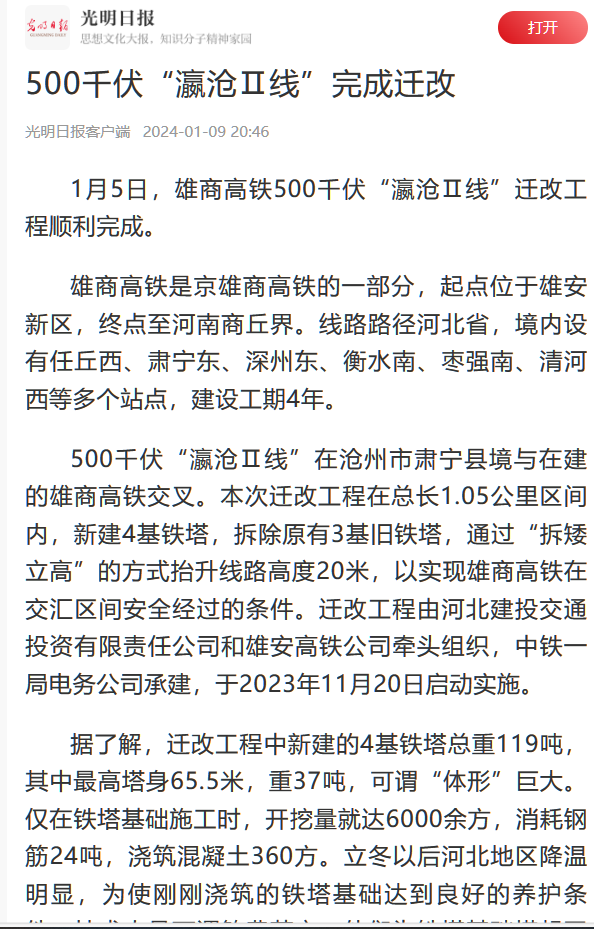 1月5日,雄商高鐵500千伏“瀛滄Ⅱ線”遷改工程順利完成。