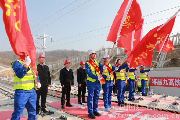 昌九城際鐵路公司黨委書記、總經(jīng)理郭建光,副總經(jīng)理羅少華,昌九城際鐵路公司昌九指揮部指揮長夏小任,中鐵一局副總經(jīng)理潘小虎,八公司黨委書記、執(zhí)行董事秦定松,新運公司總經(jīng)理李怡,八公司副總經(jīng)理張忠文,新運公司副總經(jīng)理岳恒利及設計、監(jiān)理等單位代表出席了鋪軌啟動儀式并為參建者授旗。