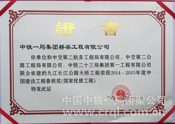 2015年11月17日上午,由首都北京傳來了令人振奮的消息,在2014-2015年度中國建設工程魯班獎(國家優(yōu)質工程)經(jīng)驗交流表彰大會的現(xiàn)場,由中鐵一局集團橋梁工程有限公司承建的九江長江公路大橋榮獲中國建筑行業(yè)工程質量最高榮譽魯班獎。橋梁公司安全總監(jiān)高虎軍和九江長江公路大橋項目經(jīng)理趙云峰出席了本次頒獎典禮,并從頒獎現(xiàn)場發(fā)回獲獎盛況。