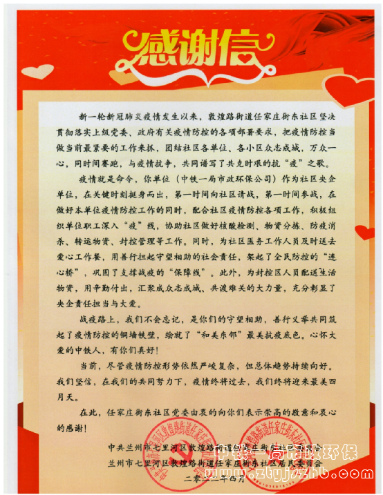 4月17日下午,蘭州市七里河區(qū)敦煌路街道任家莊街東社區(qū)工作人員給公司送來感謝信。信中對新一輪新冠肺炎疫情期間公司積極參加社區(qū)疫情防控工作,與社區(qū)群眾守望相助表示感謝。信中稱:公司積極組織職工深入“疫”線,協(xié)助社區(qū)做好核酸檢測、物資分揀、防疫消殺、轉(zhuǎn)運物資、封控管理等工作,充分彰顯了央企責任擔當與大愛。任務終有成,情誼永不斷,社區(qū)工作人員表示:希望公司能夠一如既往地關(guān)心和支持社區(qū)的全面發(fā)展,密切溝通交流。