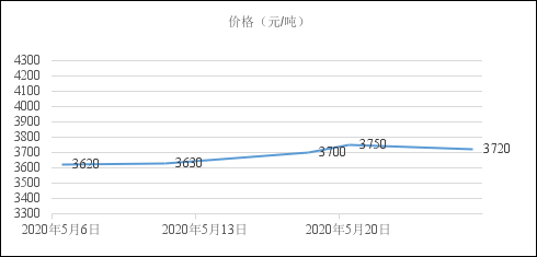 2020年5月份國(guó)內(nèi)建筑鋼價(jià)震蕩上行,截止5月底,西本鋼材指數(shù)收在3810,較上月末上漲100元/噸。下圖為西安地區(qū)螺紋鋼HRB400EФ20mm價(jià)格走勢(shì)。