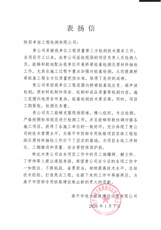 信中說,自項目開工以來,公司派駐現(xiàn)場的項目負責人及檢測人員積極配合建設單位,扎實開展橋梁樁基檢測及原材料抽檢工作,尤其在施工過程中重點加強對樁基檢測,從而提高橋梁樁基工程全方位質(zhì)量把控水準,取得了良好的成績。